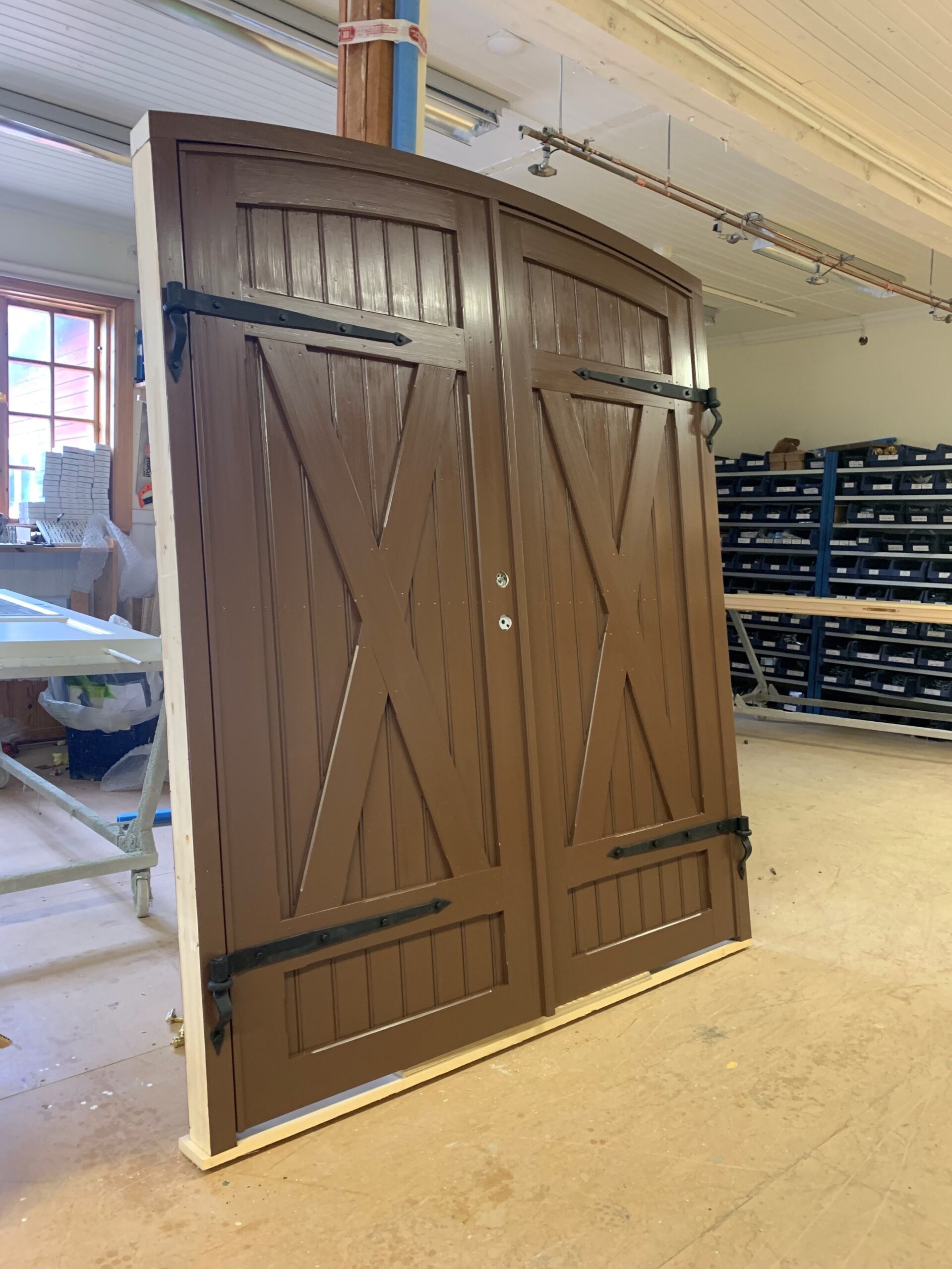 Pardörr med en panelsättning man ofta ser på äldre ladugårdar och uthus, men här som en fullt isolerad ytterdörr. Dörren har ett välvt överstycke och riktigt gammaldags hakgångjärn. Detaljbilder av denna dörr finner ni på bildnummer 54,1pp, 54,2pp och 54,3pp.