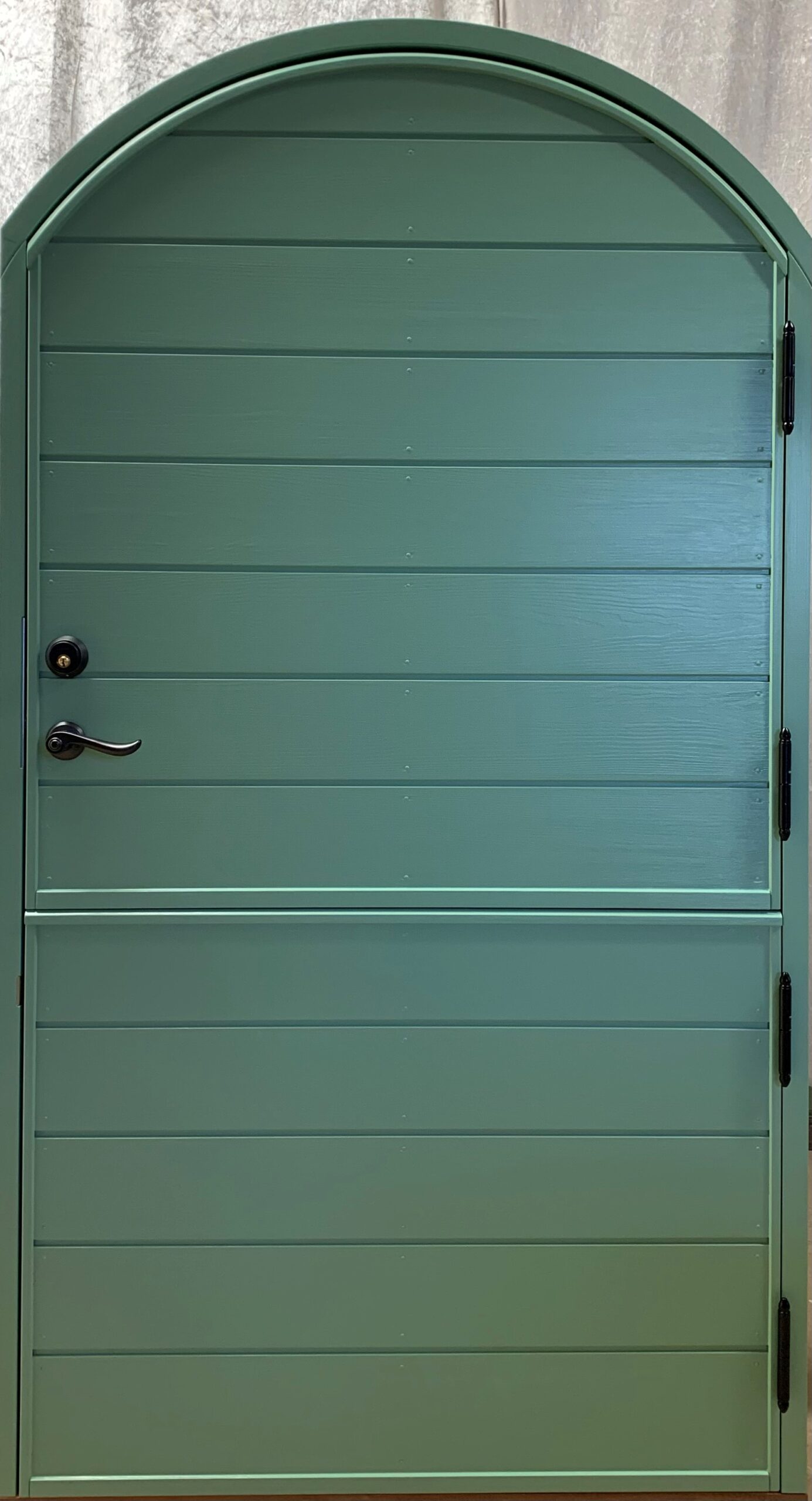 En så kallad stalldörr där den nedre delen kan lämnas stängd medan den övre öppnas. Dörren har liggande spontad panel på utsidan och spårad skiva på insidan. Paneltypen (utvändigt) är dubbelfasspont.